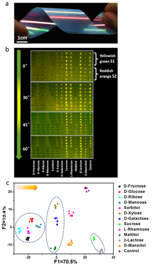 为进一步推进简单高效多底物识别技术的发展,他们制备了柔性的光子晶体膜,基于光子晶体结构色彩的角度依赖性,结合光子晶体荧光增强效应,通过改变检测角度将荧光信号进行差异化放大,从而获得丰富的荧光传感信息(图1)。通过负载2种检测络合物,该柔性光子晶体芯片可以便捷地识别检测12种高度相似的糖(图2)。这种彩虹色传感芯片,用多角度分析方法替代了多材料、多传感分子的使用,是具有通用性的多底物识别策略。由于其柔性和可印刷性的特点,有望应用于可穿戴传感器件的设计与制备。该研究成果发表在Angew. Chem. Int. Ed.2016,55, 6911-6914上。