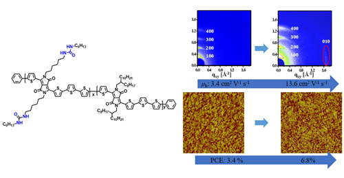 在中国科学院战略性先导科技专项的支持下,化学所有机固体院重点实验室的科研人员在调控侧链改变聚合物半导体性能的研究方面取得系列研究进展。他们在聚合物侧链中引入脲基团,得到了侧链含功能基团的共轭聚合物,如图1所示。由于侧链间的氢键相互作用,聚合物薄膜的有序性增强;与不含脲基团的聚合物相比,其场效应晶体管迁移率由3.4 cm2V-1s-1提升到13.1 cm2V-1s-1,体异质结太阳能电池光电转换效率也由3.8%提升到6.8%。此研究结果为聚合物侧链的研究提供了新的思路,最近发表在《美国化学会志》上 (J. Am. Chem. Soc.2016,138, 173)。