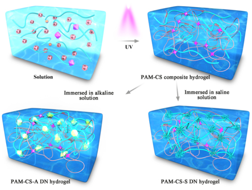 图1 将复合水凝胶转变为物理-化学交联双网络水凝胶的转变机制