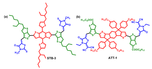 在太阳能电池领域,研究人员基于D-A结构和醌式化两种经典策略,提出通过“增强D-A体系醌式共振”设计构建有机光伏材料的新思路。通过引入醌式化TbT功能单元,设计了新型小分子给体材料STB-n(图2a),该类材料具有与PCBM相匹配的电子结构,通过侧链调控,小分子给体材料STB-3的光电转化效率高达9.26%,证明了该思路对于小分子给体材料设计的可行性,相关成果发表在J. Mater. Chem. A 2016,4, 17354-17362上。与此同时,研究人员在小分子给体材料研究基础上,通过在TbT和绕丹宁上引入拉电子基团,降低化合物LUMO能级,设计了一类非富勒烯受体新材料ATT-1(图2b)。该材料在500-800 nm范围内具有宽的光谱吸收,通过与广泛应用的给体材料PTB7-Th匹配,光电转化效率高达10.07%,相关成果发表在J. Am. Chem. Soc. 2016,138, 15523-15526上。本研究表明“增强D-A体系醌式共振”策略对于有机光伏给/受体材料设计具有重要指导意义。