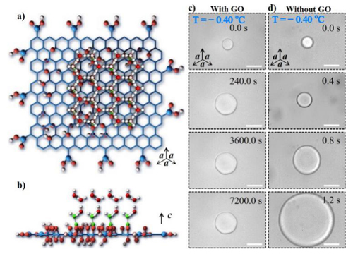 受到抗冻蛋白的启发,他们根据氧化石墨烯(GO)特有的碳骨架结构,开展了GO调控冰晶生长的研究。研究发现GO不但能有效地抑制冰晶生长和重结晶,而且能修饰冰晶形貌。分子动力学的模拟结果显示GO表面具有稳定的类冰水,使得GO更倾向于与固态的冰形成稳定氢键,从而在大量液态水存在的条件下能够选择性的吸附到冰晶的表面。GO吸附到冰晶表面后,在GO间冰晶形成曲面,通过Gibbs-Thompson效应抑制冰晶生长(图1)。