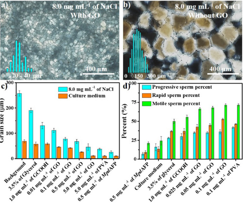 他们也首次将GO应用于低温冷冻保存细胞。当选用GO作为冷冻保存剂时,与商业化的抗冻剂相比,GO展现出了非常优异的冷冻保存效果,加入0.01 wt%的GO即可将马精子活力从24.3%提高到71.3%(图2)。这一研究发现不但拓展了二维材料的应用领域,而且大大加深了人们对冰晶形成分子层面的理解。该工作发表在《德国应用化学》上(Angew. Chem. Int. Ed.2017, 56, 997 –1001)。