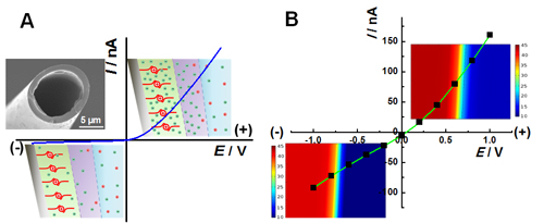 离子电流整流是一种物理现象,指的是在相同的电压驱动下,正向和逆向的离子电流大小不同,这种不同主要由生物或纳米结构离子通道中阴阳离子的不对称传输所引起。近年来,离子电流整流因其不仅具有重要的理论研究意义,而且在生物电化学传感器、流体逻辑电路、纳米离子学等领域中也具有潜在应用价值,而受到广泛的关注。但是,绝大部分的整流现象是在纳米尺度的体系中被观察到的,当孔的直径大于Debye长度的10倍时,很难观察到整流现象。而在微米尺度上的整流更是鲜见报道。