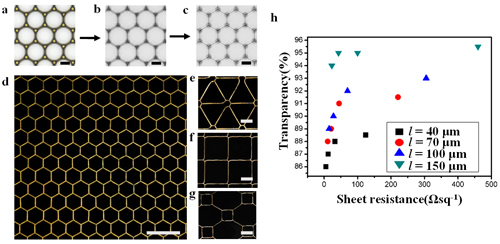 这些图案化的二维气泡为高精度印刷组装功能材料提供了新思路。通过把功能材料(如纳米颗粒、导电聚合物等)加入溶液中,随着液体的蒸发,功能材料就会在气泡边界处进行组装,形成高精度的网格图案,从而实现在透明电极等光电器件上的应用(图2)。