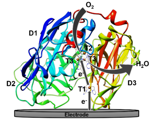 漆酶作为一种多铜族氧化酶,因其能够实现在较低过电位下对于氧气分子的电化学催化还原,因而在生物燃料电池和生物电化学的传感研究领域中备受关注。和其他生物酶相似,漆酶具有复杂的分子结构,其活性中心的铜离子(氧化酚类底物的T1铜离子和还原氧气的T2-T3铜簇,图1)深埋于酶分子的内部。这些特点决定了在常规的电化学体系中,很难实现漆酶分子的直接电子转移和基于此的生物电化学催化,尽管这些研究在生物电化学的基础和应用研究中具有极其重要的意义。