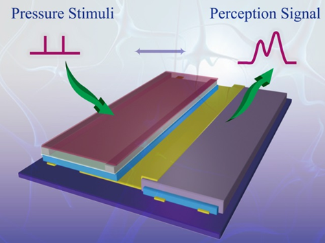 感受器是生物体实现外部信息感知的重要组成部分之一,其功能核心是将外界的刺激信号(压力、光、温度、气味等)转化为可被神经系统识别的电信号,从而引起生物体的感知和应激行为。尽管已发展的OTFT传感器可以实现上述功能,但是与该类传感器相兼容的OTFT信号处理器件和器件集成方案尚未报道。赋予OTFT传感器仿生信号处理功能是推动相关器件向生物电子应用方向发展的关键点。