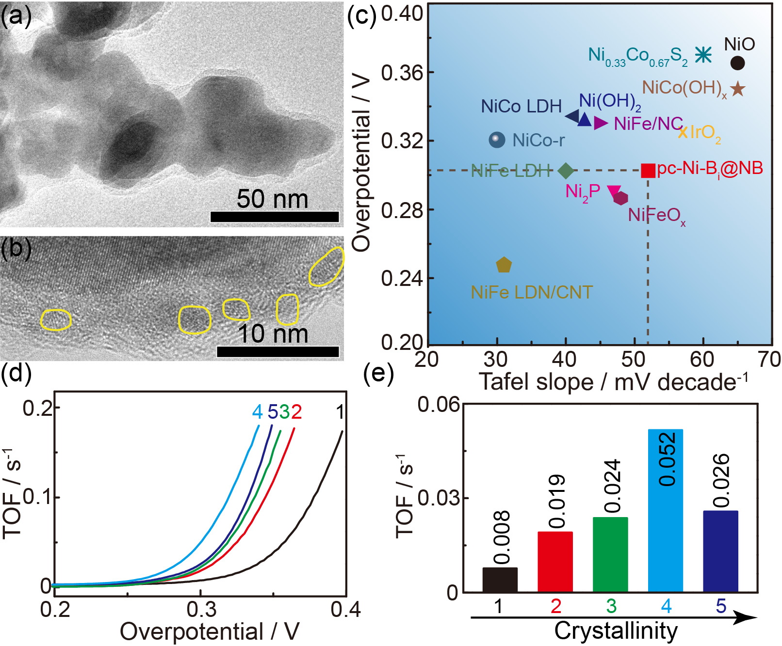 图1 (a-b) 部分结晶的Ni3(BO3)2包覆Ni3B纳米颗粒(pc-Ni-Bi@NB)的TEM照片;(c) pc-Ni-Bi@NB与文献报道催化剂的OER活性比较图;(d-e) 不同结晶度Ni3(BO3)2包覆Ni3B的电催化析氧TOF曲线及在过电位300 mV处的TOF值(1:非晶;2-5:结晶程度依次增加)。