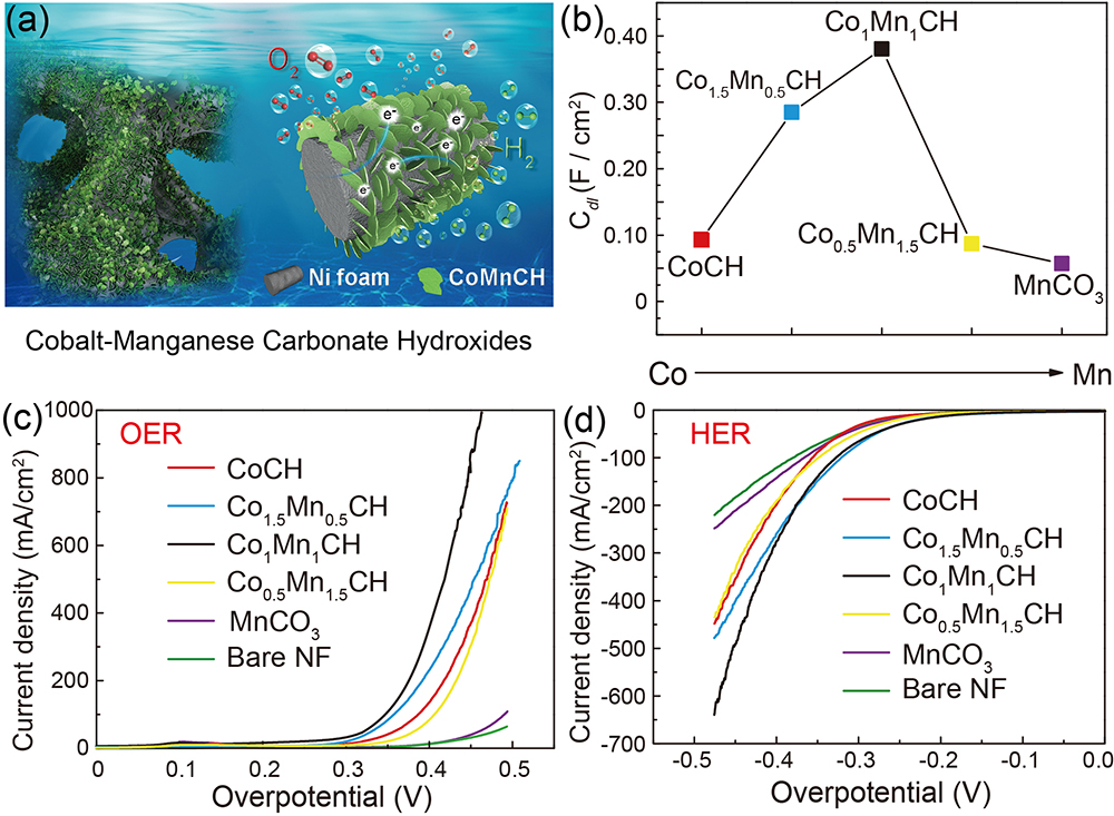 图2 (a) 锰掺杂碱式碳酸钴(CoxMnyCH)纳米片阵列电解水催化剂的示意图;(b) CoxMnyCH催化剂的电化学活性面积与Co/Mn比例的关系图;(c) CoxMnyCH催化剂的析氧极化曲线;(d) CoxMnyCH催化剂的析氢极化曲线。