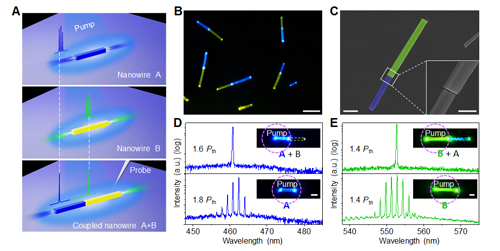 研究人员选择两种具有高光学增益性质的有机激光染料,通过可控分子组装,制备了两种染料各自形貌规整的有机单晶纳米线。进一步利用微操控手段在材料选择和结构搭建方面的灵活性,将制备的两种有机一维晶体构筑成轴向耦合的异质结,作为复合谐振腔结构。在构筑的复合体系中,每一根纳米线既可以产生对应增益区间的激光出射,又同时作为另一根纳米线的模式滤波器,在两根纳米线之间的协同作用下实现了激光模式的相互调制,从而获得了双波长的单模激光(图1)。由于不同波长的增益放大在空间上是相互分离的,所得到的轴向耦合谐振腔可以从不同端口实现不同波长相干信号的分别输出(图2),这将极大提高光子学集成器件的集成度和灵活性。相关成果发表在Science Advances 2017,3,e1700225。