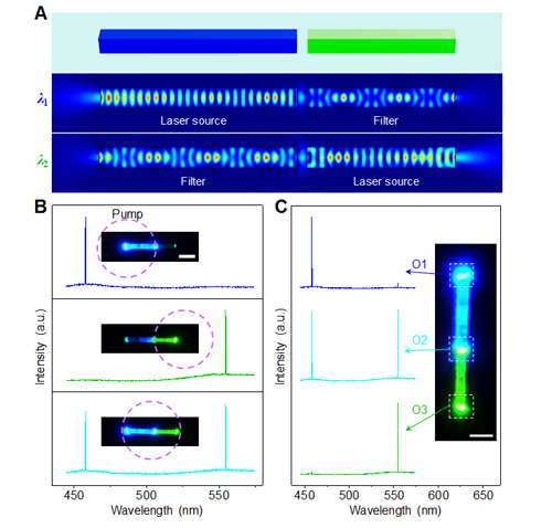 全色激光显示生物传感与成像以及光信息处理等方面的应用,要求在微纳尺度上同时输出不同波长的激光,而目前的微纳多色激光通常是将不同增益介质集成在同一器件中。然而由于缺少可适应于多增益区间的模式选择机制,所得到的微纳多色激光器大多以多模式运行。多模式激光会造成信号的随机波动和伪信号的产生,这是目前多色激光应用于各种光子学器件,尤其是光子学信息处理时所面临的一个关键瓶颈问题。最近,研究人员通过可控的纳米构筑技术,构建了不同波长有机微纳谐振腔的轴向复合结构,首次实现了多增益区间的激光模式互选,从而实现了不同波长的微纳单模式激光的可控输出,向高性能纳米光子学集成器件的可控构建迈出了坚实的一步。