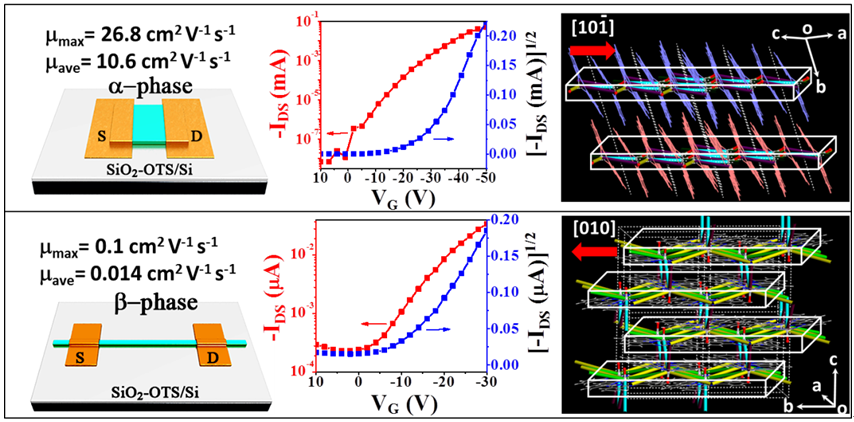 有机分子大多是通过极弱的范德华力相互作用而形成晶体,因此多晶相是有机半导体材料中非常普遍的一种现象。不同堆积结构的晶相具有不同的电子耦合作用,从而导致不同的电荷传输行为。如何可控组装生长高迁移率的晶相一直以来都是分子电子学中一个极具有挑战性的课题,涉及到分子结构、晶体工程和超分子自组装等多方面的内容。