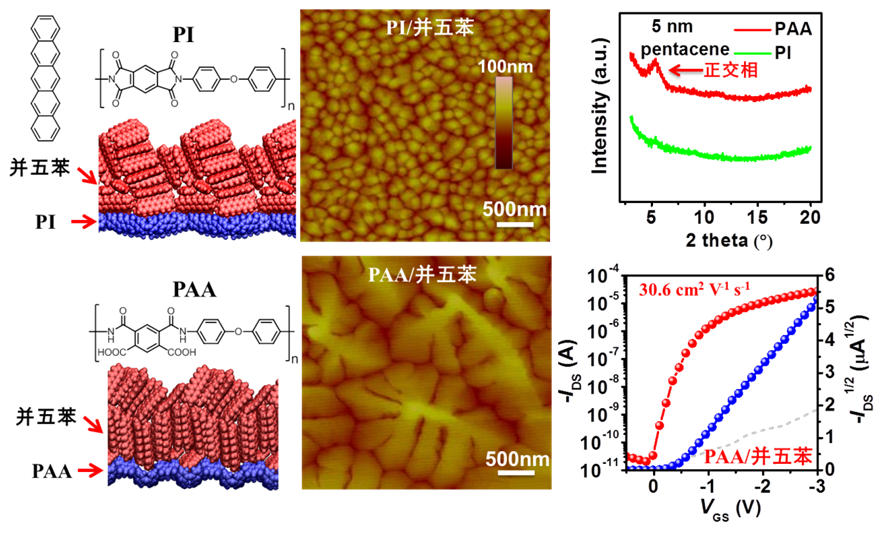 图3 并五苯在PI和PAA表面的生长方式、薄膜形貌、结晶性以及电学性质