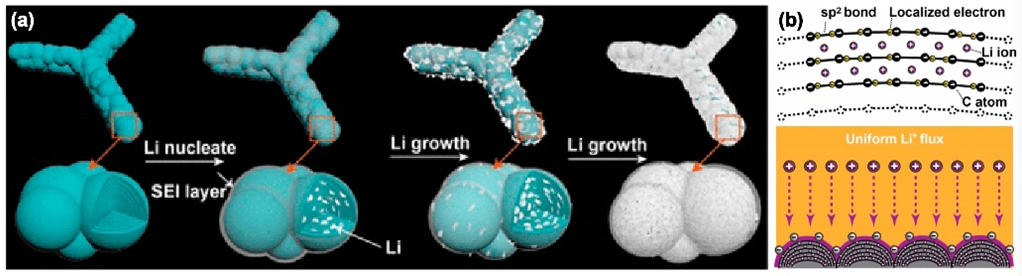 图1 金属锂在曲面石墨碳球上的(a)沉积过程及(b)沉积机理示意图。