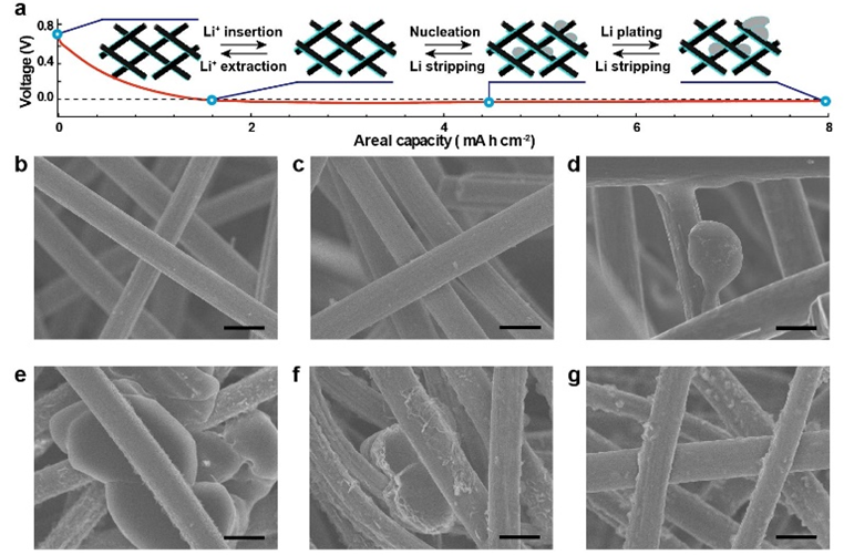 图2 (a)石墨化碳纤维的放电曲线及沉积示意图。(b)原始材料及(c)放电至0 V后,(d)沉积2 mA h cm?2后,(e)沉积8 mA h cm?2后,(f)溶解4 mA h cm?2后与(g)充电至1V时的电极表面形貌图。