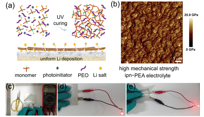 为提高电池安全性并进一步解决液态电解液体系中的锂枝晶问题,研究人员设计并构筑了一类双功能互穿网络结构聚(醚-丙烯酸酯)固体电解质(图3),该固体电解质(ipn-PEA)集高机械强度(约12 GPa)和高室温离子电导(0.22 mS cm?1)于一体,使锂的沉积/析出均衡进行。由于具有降低界面电阻和加速锂离子传输的双重作用, ipn-PEA电解质有效地抑制了锂枝晶生长,重塑了室温固态锂金属电池的可行性(J. Am. Chem. Soc.,2016, 138, 15825)。