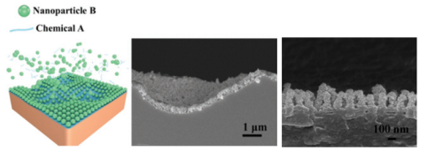 带电纳米颗粒与可反应小分子组装示意图,及在微米和纳米尺度微结构表面构筑的共形纳米涂层照片