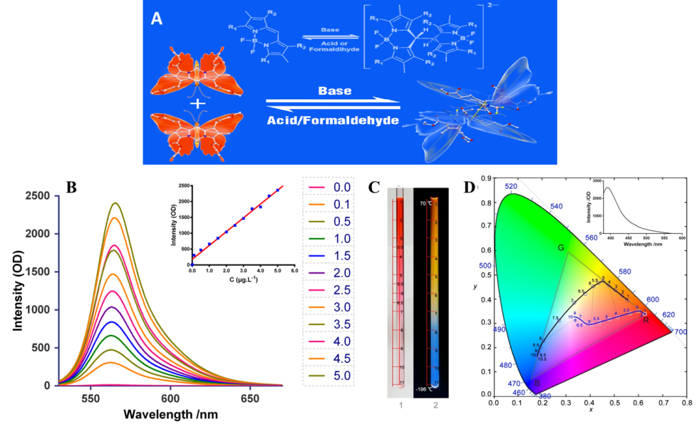 图B:BODIPY二聚反应体系对甲醛(B)的光谱响应;图C和D:BODIPY二聚反应体系对温度的荧光响应。