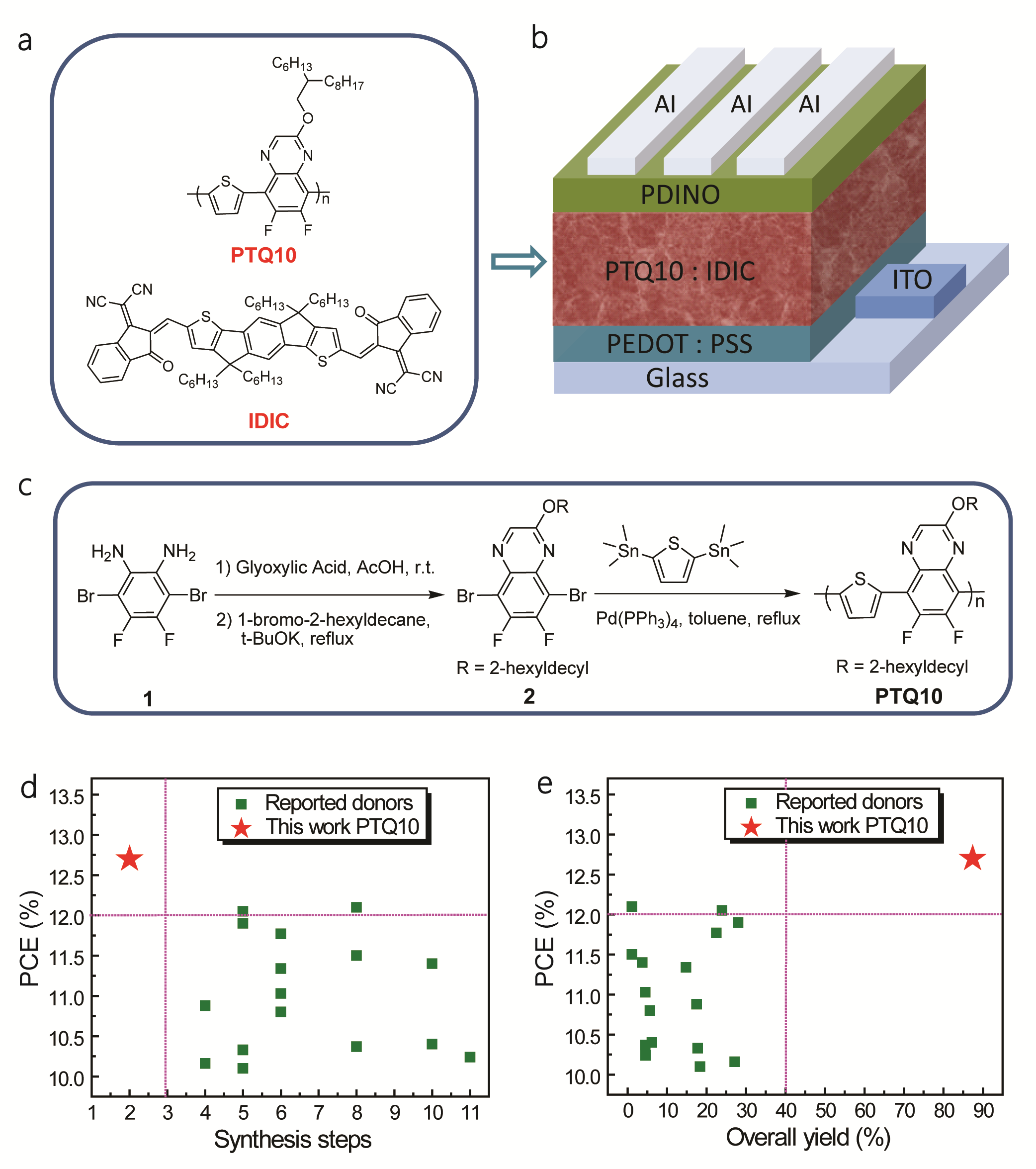 图1 (a)给体PTQ10和受体IDIC的分子结构;(b)电池器件结构图;(c)PTQ10的合成路线;(d)和(e)聚合物太阳电池给体材料合成步骤、产率与效率的对比分析图。