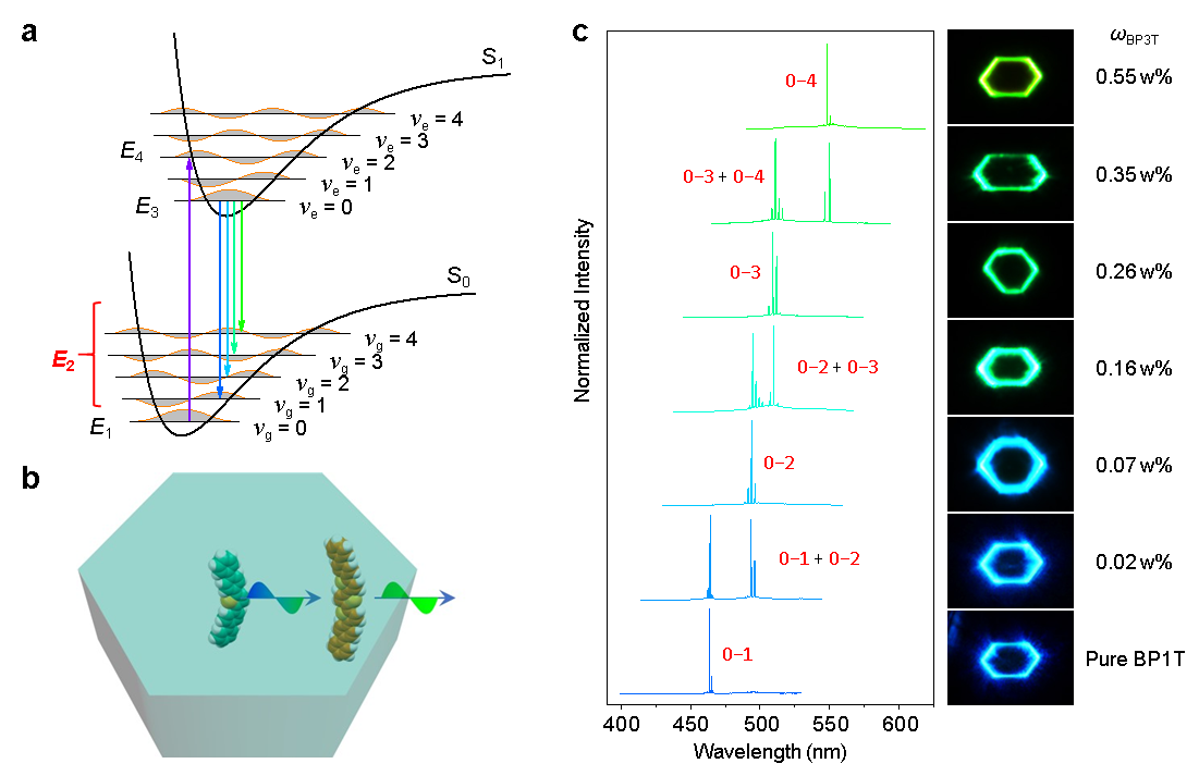 有机材料具有宽的发光峰,非常适合构筑波长可调谐微纳激光器。然而,有机材料的发射受佛兰克—康登(Franck-Condon)原理支配,通常只在短波0–1振动峰处具有较高的辐射跃迁几率,而其他能级之间的跃迁受到明显抑制,因此有机材料通常只有短波振动带处的激光发射。最近,光化学实验室的科研人员通过调控振动辐射跃迁,成功突破了弗兰克—康登原理对有机材料增益区间的限制,实现了波长可切换以及宽谱可调谐的有机微纳激光。