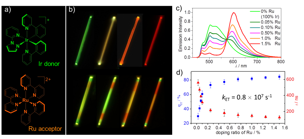近期,在国家自然科学基金委和中科院先导项目支持下,光化学实验室和分子动态与稳态结构实验室科研人员进行合作,选取两种结构和溶解度相似的金属铱、钌光功能配合物作为能量给、受体,通过溶液再沉淀自组装法,制备了双组份均匀掺杂或异质结纳米棒。受益于微纳晶结构的高规整度以及给、受体之间能级和光谱的高度匹配,这些低维材料表现出高效三线态能量转移效果。通过改变钌配合物受体的含量(0 – 1.5%),一维晶体呈现出绿、黄、橙、红等不同颜色发光。当给、受体比例为200:1 时,其能量转移效率达到75%以上,能转移速率接近107 s-1。理论计算和实验结果表明,该三线态体系的能量转移以Fo?rster共振耦合参与的激子扩散机理为主。在进一步研究中,科研人员利用能量转移引起的多色发光,成功实现在微纳尺度下对纳米棒多级组装过程的原位观察和不同波段下光信号波导输出和逻辑处理。相关研究工作发表于J. Am. Chem. Soc.2018,140, 4269-4278。
