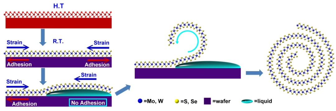 图1 CVD生长的TMDs片自卷曲的示意图