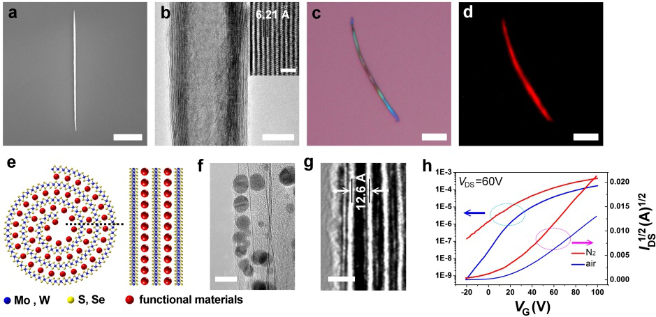 图2 MoS2纳米卷的形貌 (a)、结构 (b)、光电性能表征 (c, d, h) 及复合TMDs纳米卷 (e, f, g)。(比例尺:a, c, d, 5 μm; b, 20 nm, 插图, 2 nm; f, 10 nm; g, 2 nm.)