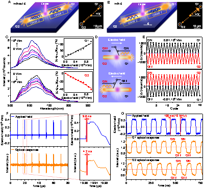 研究发现,这样产生的光二极管效应对电场的响应速度非常快(<3 ns,图1F)。通过改变电场强度,可以对光学二极管行为进行调控;当电场方向发生反转时,不对称性也相应地发生反转。在此基础上,研究人员对有机纳米线光学材料施加一个高频脉冲交流电场,当电场方向发生快速转换时,光子向两边传输的不对称性可以进行快速切换,利用一个控制信号,在纳米线的两端得到相位相反的交变输出信号,从而实现了高频率、快速响应的单刀双掷微纳光开关(图1G)。这是首次在微纳结构中通过外加静电场调控光子行为来实现这一功能,这一结果为实现对光子学功能器件的远程控制,优化集成光子器件结构提供了重要借鉴,相关结果发表在Science Advances 2018, 4, eaap9861。