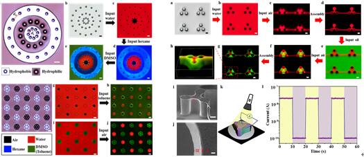 在上述研究基础上,他们利用微结构模板来调控不相容的流体界面形成图案化。利用固体微结构调控流体间相互取代过程,他们提出了一种任意不相容流体界面间的流体图案化技术(图1)。结合理论分析,他们提出了微结构浸润性和几何结构的设计原则,并用于制备不同形貌的流体图案,实现了流体间界面的可编程图案化(图2左)。这种以微流体技术为基础的对溶液的在微米和纳升尺度的调控,在以溶液加工为主体的器件制备技术中具有重要的应用。他们把流体图案化技术与功能材料的蒸发组装技术结合起来,实现了微型立体光电探测器的制备,显示出了良好的光电响应性(图2右)。该工作在发展微型器件的制备新方法方面具有重要的意义, 其成果作为前封面报道发表于近日的Adv. Mater.2018, 1802172上。