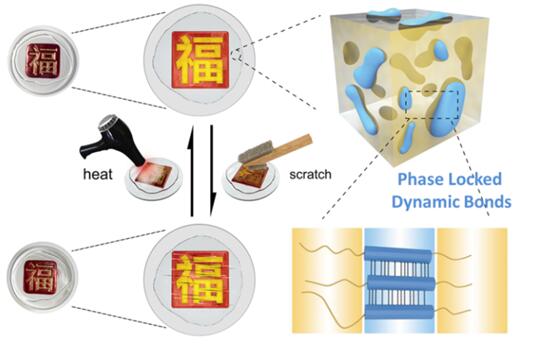 在国家自然科学基金委的支持下,化学所工程塑料院重点实验室科研人员致力于智能材料的开发与应用,取得了系列进展(J. Polym. Sci. Part A: Poly. Chem. 2015, 53, 2094-2103;Polymer 2016, 84, 1-9; Mater. Chem. Front.2017, 1, 111-118; ACS Appl. Mater. Inter. 2017, 9, 30046-30055; Macromolecules 2018, 51, 1100-1109)。在此基础上,从分子设计角度出发,提出了一种新型自修复设计策略“Phase Locked Dynamic Chemical Bonds(相锁定动态化学键)”,成功制备出无色透明、可快速自修复的高韧高强聚合物。