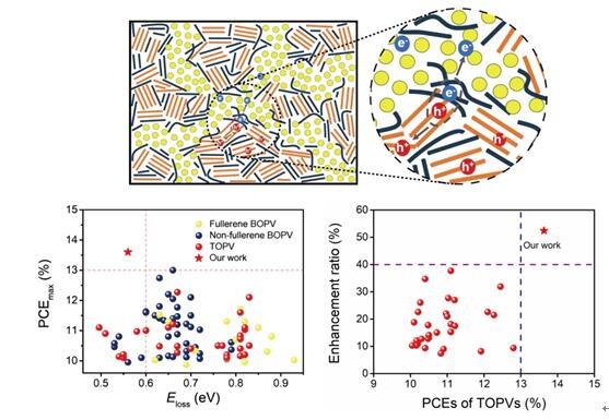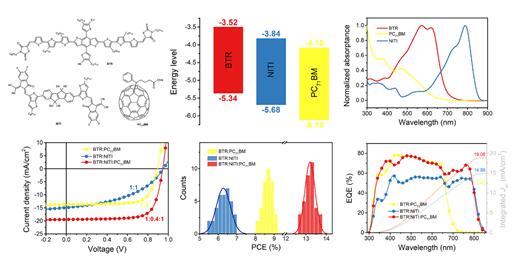 具有带隙高度可调、质轻、柔性、低成本等显著特点的有机太阳能电池是新一代光伏技术的重要发展方向。有机太阳能电池受限于有机材料“窄吸收”特性,二元共混薄膜难以实现对太阳能的有效宽光谱利用,并且始终存在相共混(利于激子解离)和相分离(利于电荷传输)这对基础性矛盾,制约了有机光伏器件性能的进一步突破。三元有机太阳能电池保持单节电池结构,在二元活性层中引入吸收互补的第三组分,增强光谱吸收。尽管三元电池取得了一定成功,但仍面临着严峻的挑战,其核心问题在于对三元共混薄膜难以实现清晰、有效的形貌控制,用以同时保证高效的激子解离和电荷传输,因此,已报道三元电池性能提升幅度较低。
