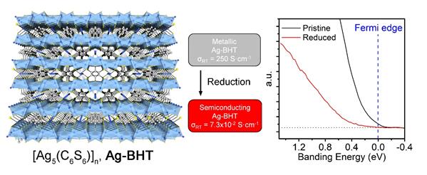 图1 左图为Ag-BHT的晶体结构,通过适当的化学还原,Ag-BHT可以从高电导率的金属态(简并半导体)向半导体转变,UPS同样反应了变化过程,还原后的Ag-BHT费米边消失。