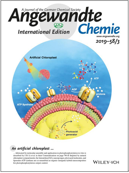 基于以上研究工作,科研人员最近从天然叶绿体结构出发,利用可牺牲模板法获得了能高效包埋光酸分子的多腔室介孔二氧化硅材料,随后在其表面重组含有ATP合酶的磷脂双层,从而构筑了一种“人工叶绿体”分子组装系统。进一步研究表明,在光照下,上述分子组装体系在体外可实现了可控与高效的ATP合成。该体系的建立为提高光能利用率提供了新途径和新思路,被评审人认为是最接近真实叶绿体结构和功能的人工合成系统。相关研究成果发表在近期的 Angew. Chem. Int. Ed.2019,58,796, 并被选为“Hot paper”。