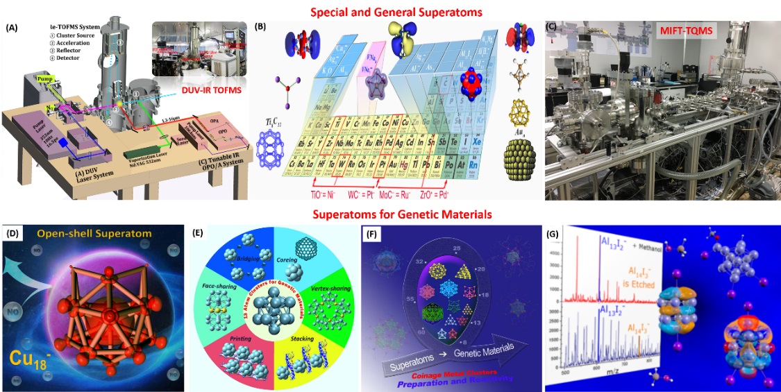 图1. (A) 自主研制的国家重大仪器(深紫外二期子项目)DUV+IR质谱光谱仪;(B) 狭义和广义超原子概念的提出 (Acc. Chem. Res. 2014,47, 2931); (C) 基于科学院仪器研制项目支持的离子层流反应管串联自定义多重四极质谱系统;(D) 开壳层超原子团簇Cu18-的发现 (J. Phys. Chem. Lett., 2020, 11, 5807); (E/F) 金属团簇应用于材料基因 (Coord. Chem. Rev., 2019, 400, 213053; 2020, 213643);(G) 卤素配体保护/活化超原子团簇(Chem. Sci. 2016, 7, 3067)
