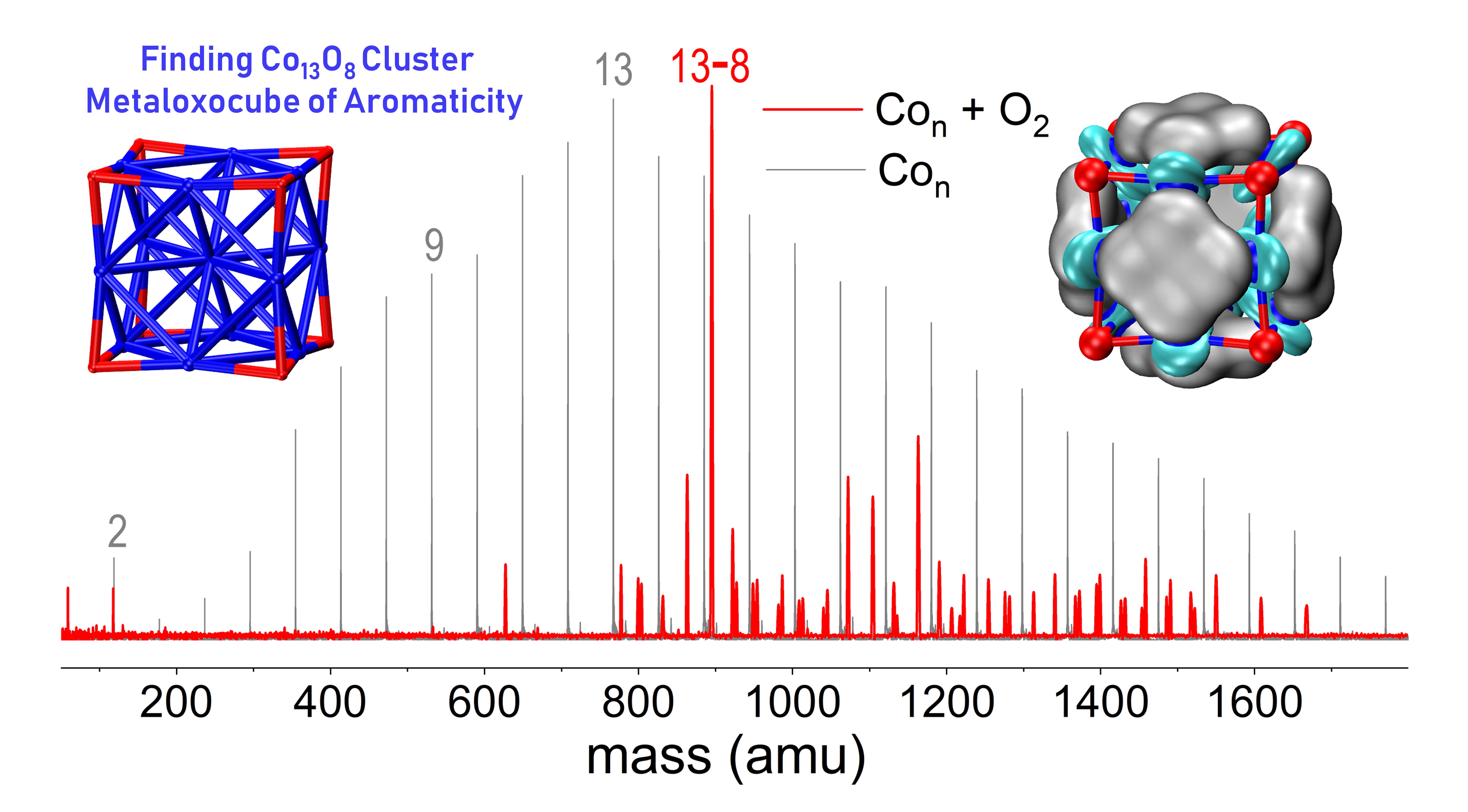图2. 中性Con纯金属团簇质谱分布及其与大量氧气反应后的质谱;插图为Co13O8氧立方结构及其芳香性描述