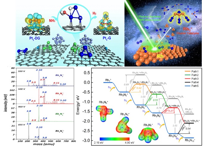 图1. Pt3团簇催化氨分解(CCS Chem. 2019, 1, 215)与 Plasma辅助的Rh3团簇催化N≡N键解离 (J. Phys. Chem. Lett., 2020, 11, 8222)。