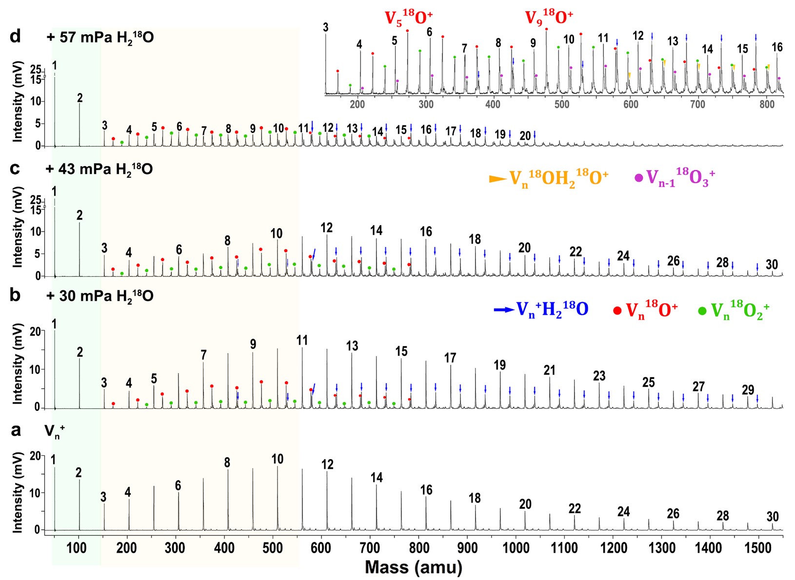图2. 钒团簇(Vn+)及其与水(H218O)反应的飞行时间质谱图(Commun. Chem., 2020, 3,148)。