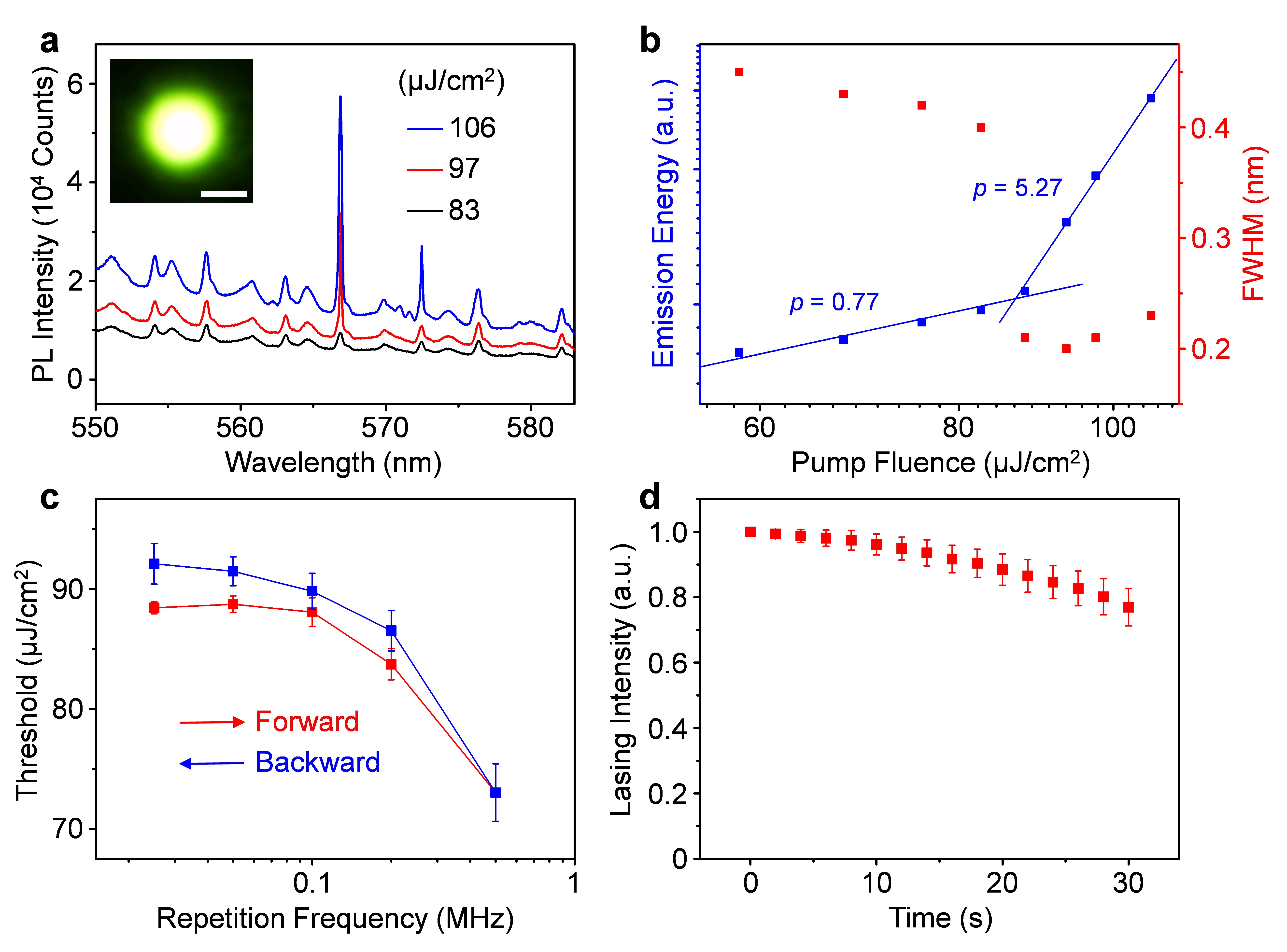 最近,研究人员受到热活化延迟荧光(TADF)材料的启发,提出了利用这些材料中独特的反向系间窜越(RISC)过程,解决有机固态激光器中的三重态损耗难题的策略。研究团队根据激光理论筛选出了高发光效率和高RISC效率的TADF体系并与高光学质量的微腔结合,首次在升温过程中观察到了独特的热活化激光现象(图1),直接从实验上证明了体系中的三重态激子可以被RISC过程捕获并用于单重态受激辐射。研究人员进一步将这种独特的激光机制应用于更具有挑战性的有机准连续激光领域,成功实现了准连续区间内的有机激光(图2),为最终实现有机电驱动激光提供了有意义的借鉴。该研究成果发表于近期出版的德国应用化学(Angew. Chem. Int. Ed.2020,59, 21677-21682)上,通讯作者是闫永丽研究员和赵永生研究员,第一作者是周忠豪博士。