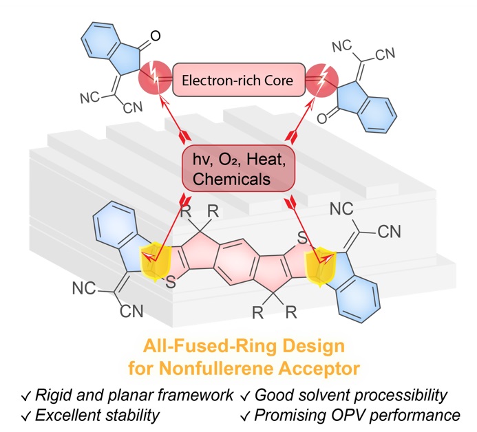 有机光伏具有质轻、柔性和可大面积加工等优点,受益于分子光伏受体材料的发展,其能量转换效率已经达到18%。为实现商业化应用,材料和器件的长期光热稳定性仍面临挑战。传统D-A型电子受体材料普遍采用3-(二氰基亚甲基)靛酮(INCN)及其衍生物作为强拉电子末端,然而INCN类受体材料在光、水氧、热和碱等作用下容易发生降解,已经成为制约器件稳定性的关键因素。