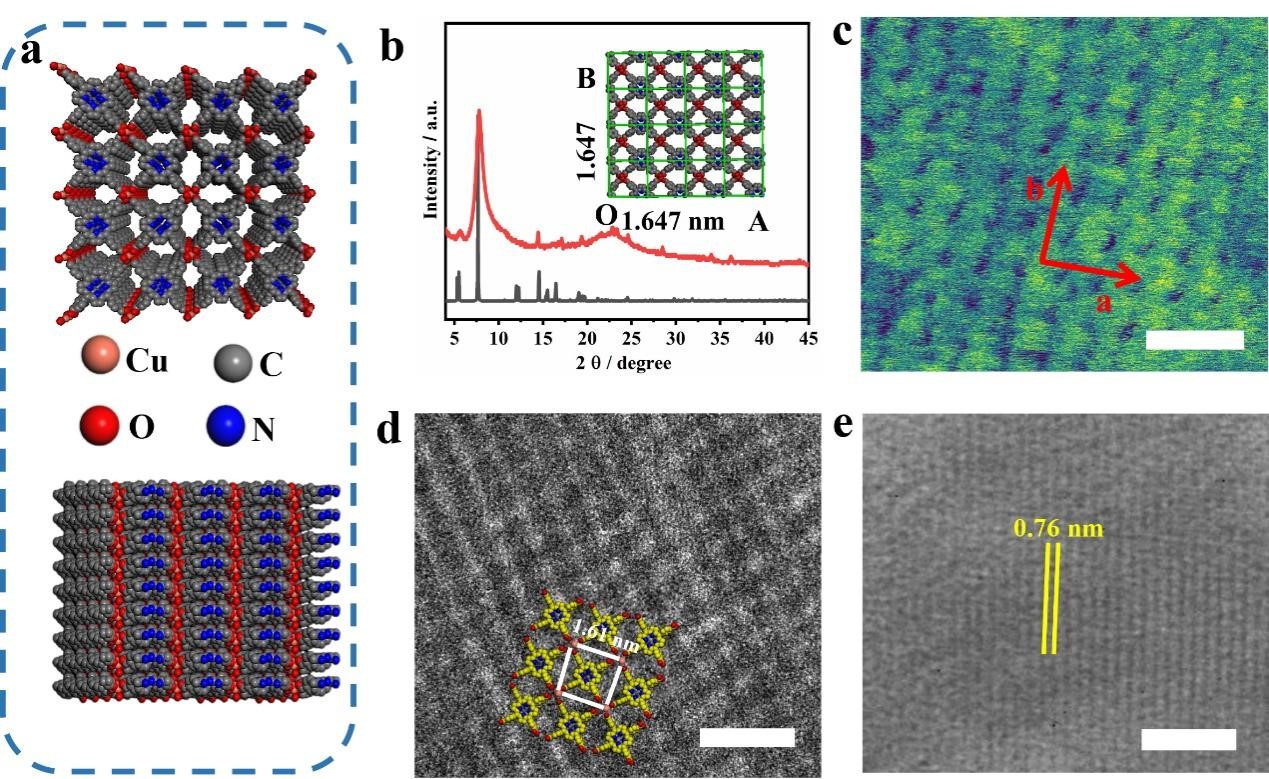 图1 (a) 二维Cu2(TCPP) MOFs的结构示意图;(b) XRD;(c) HRAFM图像;(d) (100)面的Cryo-TEM图像;(e) (001)面的Cryo-TEM图像。