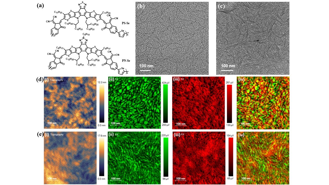 (c)PBDB-T:PS-Se氯仿溶液的冷冻电镜图像。AFM和PiFM图像:(d) PBDB-T:PN-Se样品的图像;(e) PBDB-T:PS-Se样品的图像;