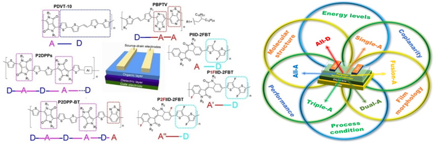 图1. 该团队发展的部分代表性分子结构(左图);高迁移率D-A材料设计、加工技术以及器件性能的构效关系(右图)。