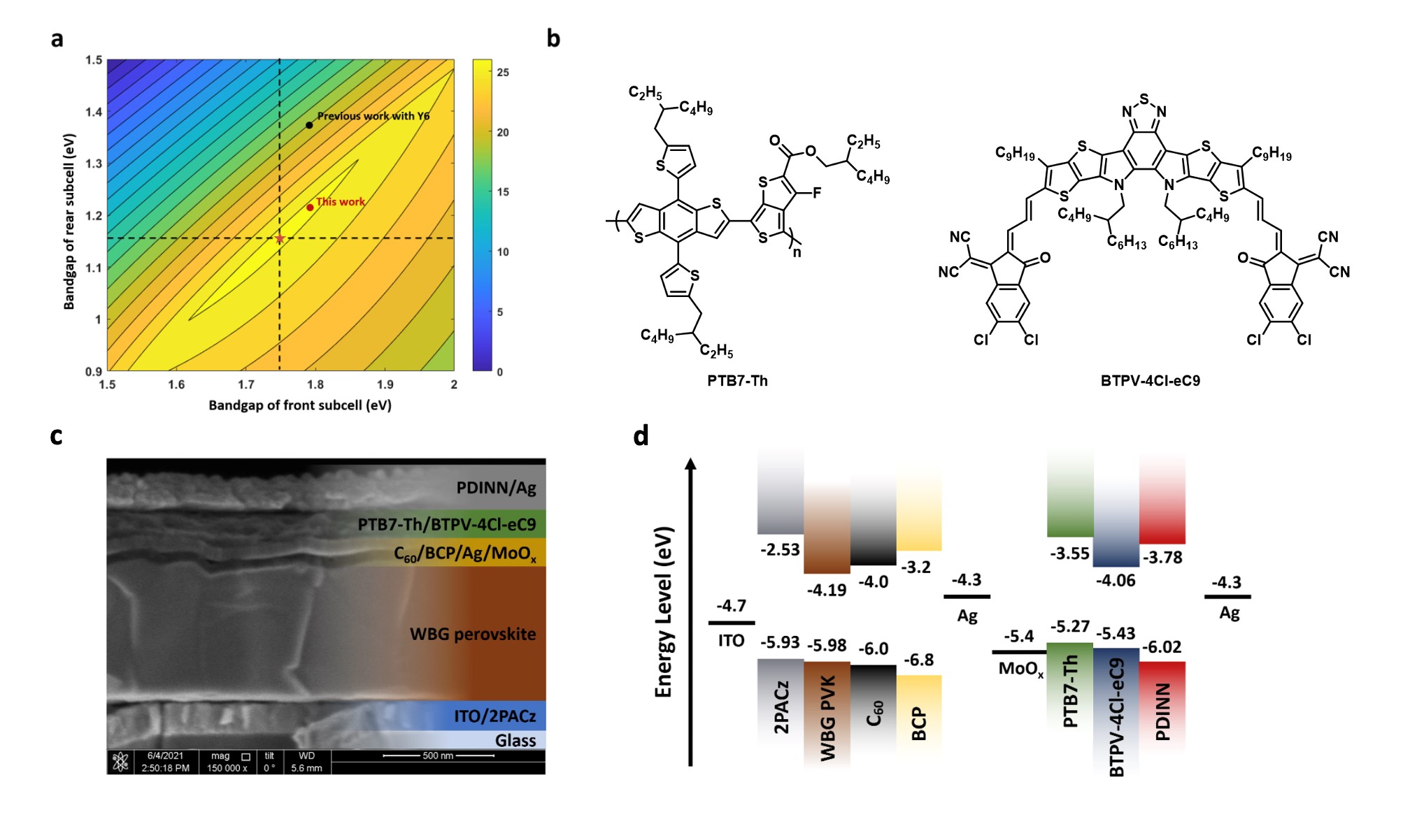图1. (a)双结叠层太阳电池效率与前后结活性层带隙匹配模拟图;(b)有机后结太阳电池中使用的给体、受体材料化学结构;(c)钙钛矿/有机叠层太阳电池截面SEM图像;(d)能级排布图。