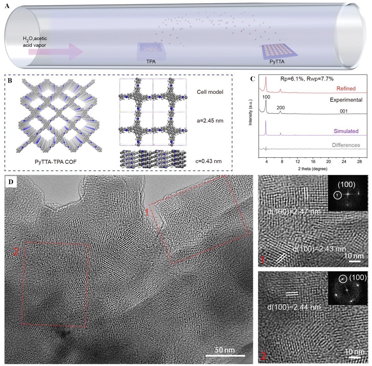 图1 (A) 化学气相诱导转化法制备PyTTA-TPA COF薄膜示意图;(B) PyTTA-TPA COF的结构示意图;(C) PyTTA-TPA COF薄膜的理论模拟和实验GIWAXS谱图;(D) PyTTA-TPA COF薄膜的TEM照片。