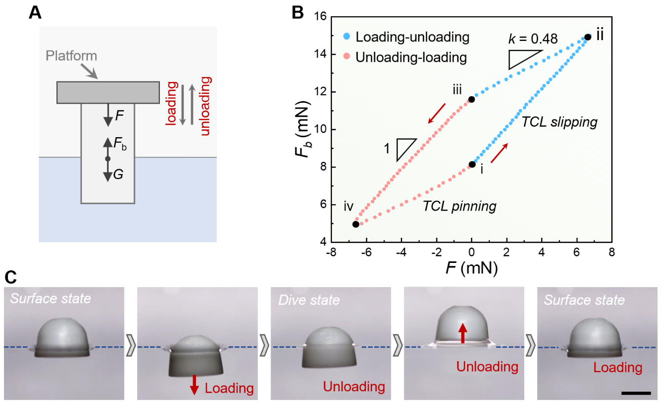 近日,宋延林研究团队发现,从不同高度落入水中的物体,稳定后可以在水面上呈现不同浸没深度,从而表现出不同的漂浮状态 (图1)。也就是说,物体漂浮时的浮力并不是固定的,而是受到下落过程的影响。理论分析表明,由于固-液粘附作用,物体入水后的三相接触线表现出钉扎-滑移-钉扎的三阶段动力学行为,这是物体呈现不同漂浮状态的根本原因。据此,他们提出了“浮滞回线”来指导调节物体漂浮状态。研究发现,改变外力的加载-卸载顺序能够实现物体漂浮状态的调控 (图2)。随后,他们展示了可变漂浮状态在界面催化、液体蒸发和药物释放等领域的应用。这一研究加深了人们对漂浮过程中界面现象的理解,在相关领域具有重要的启示意义。相关成果近日发表于Proceedings of the National Academy of Sciences of the United States of America期刊(https://www.pnas.org/doi/10.1073/pnas.2201665119 ),论文第一作者是博士生李安,通讯作者是宋延林研究员和李会增副研究员。