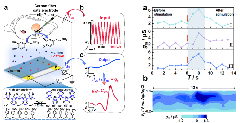 图1. 快速电压扫描门控的有机电化学晶体管多巴胺传感器机制与鼠脑内多巴胺基础值与电刺激下多巴胺释放动力学的实时监测