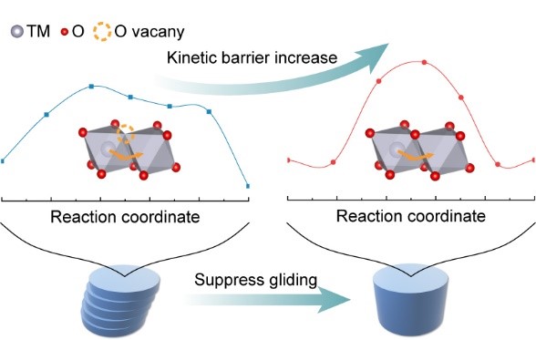 除上述问题以外,由于高镍正极所属的层状过渡金属氧化物正极的晶体结构特点,机械化学失效(滑移、裂缝和扭折)成为其商业应用面临的另一重要科学问题。最近,课题组与中科院物理所肖东东等合作在高镍单晶正极的机械化学行为研究方面取得新进展。通过对高镍单晶正极在充放电过程中的滑移现象进行深入研究,在原子尺度上揭示了滑移的不同表现形式和过渡金属离子层内迁移的运动过程。基于实验与理论计算,提出了减少氧空位以提高位错运动势垒,进而抑制材料层间滑移和裂缝的改性方法(图1);低氧空位单晶高镍正极材料表现出更优异的电化学性能,实验验证了该方法的可行性,为设计构筑高性能单晶高镍正极材料提供了有益参考。这一研究成果近期发表在J. Am. Chem. Soc. 2022, 144, 11338–11347上。