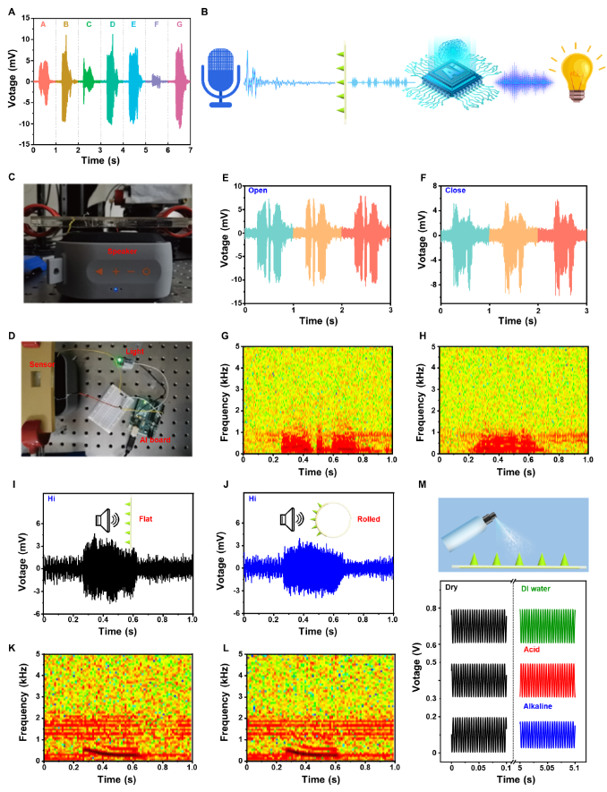 图1. 微锥阵列柔性压电声敏器件应用演示图