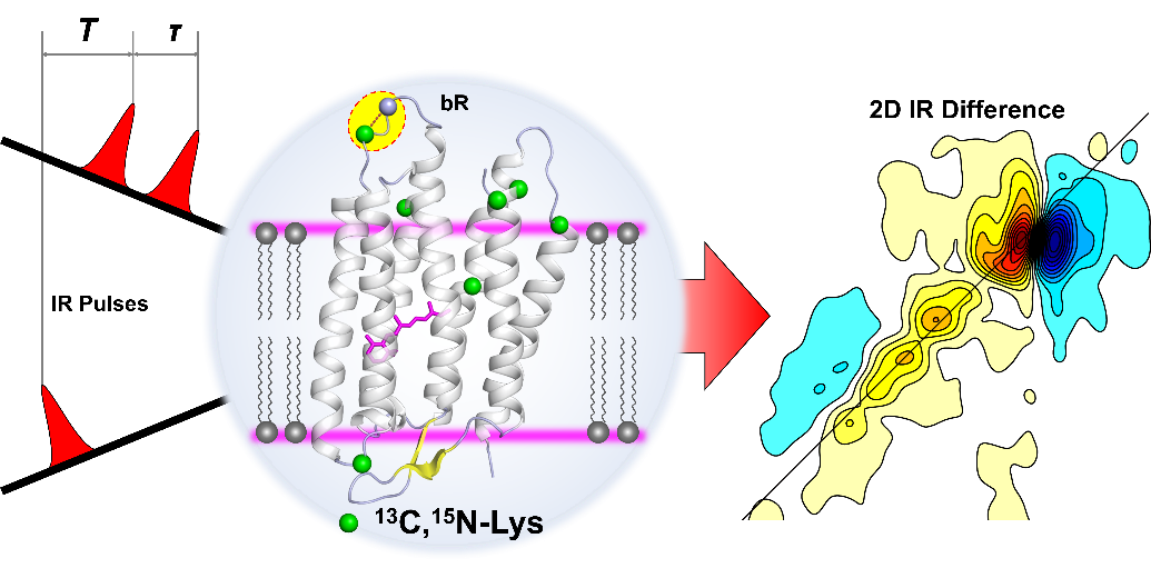 细菌视紫红质Bacteriorhodopsin(bR)是嗜盐杆菌细胞膜上充当能量转换开关的跨膜蛋白,通过其质子泵功能可实现从光能到化学能的转换。自1975年首次获得晶体结构以来,随着技术的发展,bR的结构解析越来越精细。但由于测量方法的不同,bR的结构,特别是其在非螺旋区的结构,不同方法存在很大不同。此外,bR的细胞质侧和细胞外侧表面结构动力学对光循环中质子的释放和摄取至关重要。传统的生物物理学手段,包括电子和X射线晶体学,对刚性的膜蛋白结构比较敏感,对于超快的结构过程,这两者都缺乏足够的时间分辨率。此外,实验上很难实现在合理的时间和空间分辨率下直接探测构象的快速动态转换。二维红外光谱方法由于具有亚皮秒的时间分辨率和化学键结构分辨率,可以揭示分子的动态结构分布及其动力学。因此,发展基于二维红外光谱的新方法有望解决bR结构领域的这些挑战性问题。