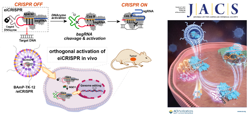 在科技部、基金委和中国科学院的支持下,化学所活体分析化学院重点实验室汪铭课题组围绕可控及细胞选择性CRISPR/Cas9技术开展研究,发展了酶诱导的CRISPR系统(enzyme-inducible CRISPR, eiCRISPR),实现了细胞选择性基因编辑。eiCRISPR由三部分组成,包括Cas9核酸酶、自封闭失活的引导RNA(bsgRNA)以及化学修饰的脱氧核酶DNAzyme,其中DNAzyme可特异性降解bsgRNA的自封闭区进而激活CRISPR系统。为了实现可控及细胞选择性基因编辑,他们通过设计优化DNAzyme磷酸骨架的化学修饰,抑制了其降解bsgRNA自封闭区的能力。而外源性光信号、内源性化学微环境(如细胞内活性氧、NQO1酶)等可选择性触发化学修饰DNAzyme的脱笼反应,激活DNAzyme并降解bsgRNA的自封闭区,进而激活eiCRISPR系统。进一步,研究人员利用课题组发展的可降解脂质纳米颗粒(LNP)递送系统,实现了细胞及活体层次eiCRISPR的高效递送和在体激活。研究发现,eiCRISPR可在肿瘤组织中被选择性激活,并编辑、敲低人乳头瘤病毒18(HPV18)E6基因,从而用于潜在的肿瘤治疗。该方法为解决CRISPR/Cas9技术中面临的基因编辑脱靶效应以及缺乏疾病靶向性等挑战提供了新策略。该研究工作近期发表于J. Am. Chem. Soc.(2022, 144, 22272-22280),论文第一作者为博士研究生蔡玮琦,通讯作者为汪铭研究员。