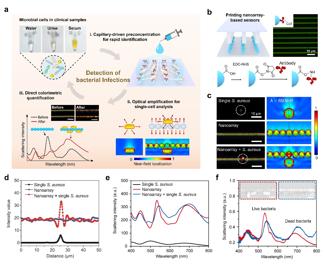 最近,该课题组将一维纳米结构的光学信号放大作用与蒸发过程中毛细力驱动的颗粒预富集相结合,设计出了一种快速超灵敏的微生物检测芯片。他们以聚苯乙烯微球悬浮液为墨水,在基底上印刷制备了大面积的一维纳米光子结构,并利用聚苯乙烯微球表面大量的羧基高效偶联抗体,特异性地识别待检测样本中的致病菌。研究发现,将毛细力诱导的咖啡环效应引入微生物检测,可以在基底上对目标病原体进行预富集,提高检测效率。除了捕获细菌,纳米光子结构还具有强的光场局域能力,可以显著增强细菌的散射光信号,提高检测灵敏度,能够在单细胞水平上对其物理特征如生理环境、活性、繁殖状态进行可视化分析。进一步,他们实现了连续监测水、血清、尿液以及蔬菜等样本中的细菌情况。这种生物检测芯片制备简单,成本低,能够结合普通的商业显微镜或者手机直接获取检测结果,在医疗诊断、食品安全、环境监测和农业等领域具有广泛的应用前景。相关研究成果近期发表在Adv. Mater.2022, DOI: 10.1002/adma.202211363,文章第一作者是博士后张泽英,通讯作者是宋延林研究员和苏萌研究员。
